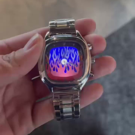 Crafted in premium stainless steel with a bold 42mm dial, this watch fuses retro design with futuristic flair. Its dynamic flame-animated display sets it apart, bringing energy and movement right to your wrist.